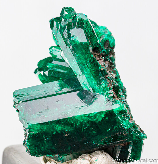 Cluster of bright, translucent, deep emerald green crystals of Dioptase from the Congo. Aesthetic spray of Dioptase crystals attached to a large, 1cm thick crystal forming the base. The large crystal is contacted at both ends but is not damaged. Nothing but solid Dioptase without matrix.