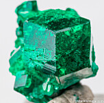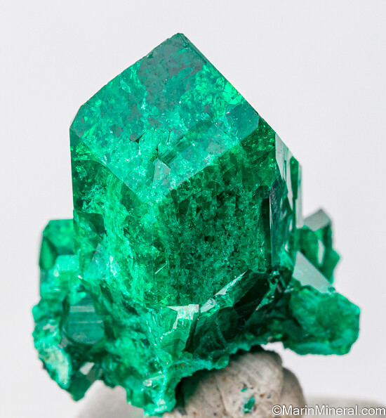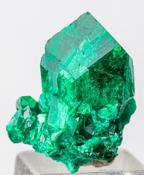 Emerald green crystals of Dioptase from the Congo. A fine thumbnail composed of a single large crystal with a smaller crystals around the base. I purchased a large number of similar pieces from recent finds, and this was one of the very best, with a large central upright crystal. Valued at $150.