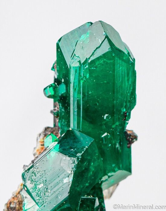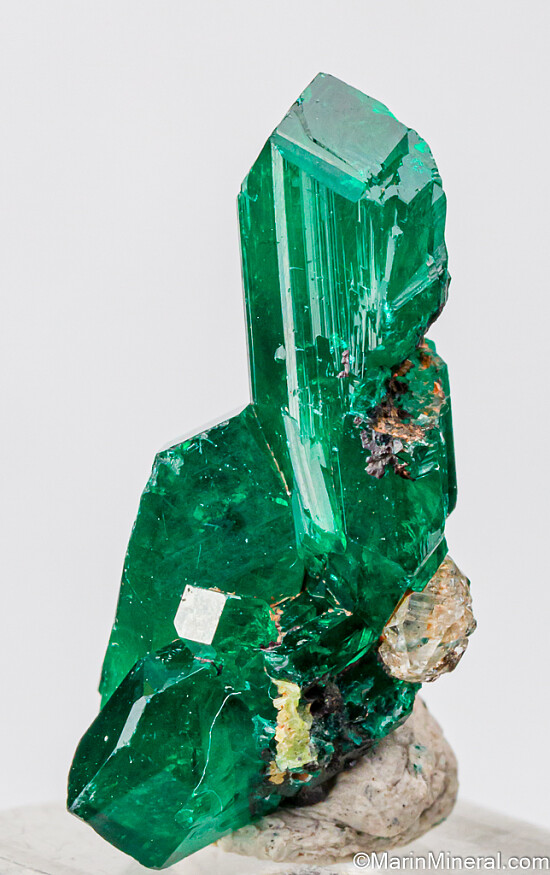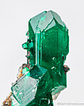 Cluster of bright, translucent, deep emerald green crystals of Dioptase from the Congo. Nothing but solid Dioptase without matrix. Main crystal is 1.5cm, doubly-terminated, and has a small Quartz crystal attached to one tip.