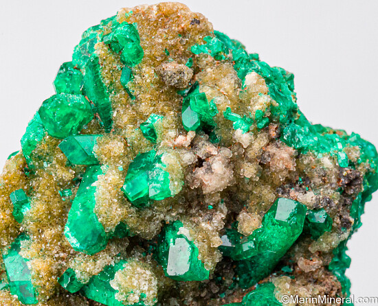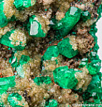 Elongated crystals of bright, translucent, deep emerald green crystals of Dioptase from the Congo. The crystals rise out of a drusy Quartz covered matrix of solid Dioptase.