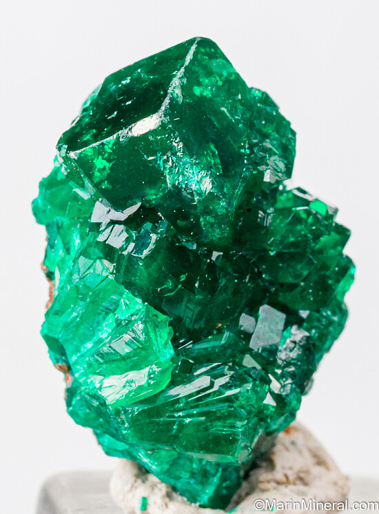 Cluster of bright, translucent, deep emerald green crystals of Dioptase from the Congo. Nothing but solid Dioptase without matrix. Big locky, lustrous crystals.