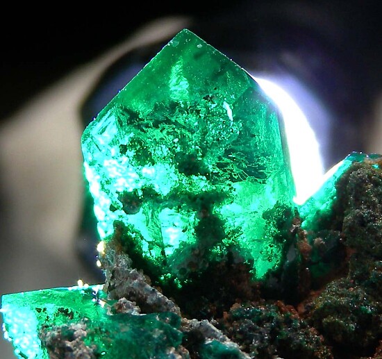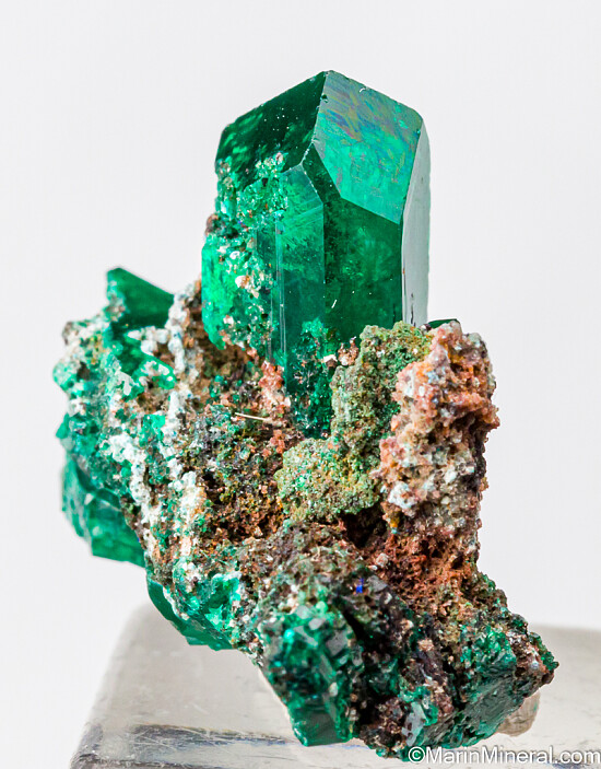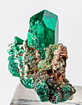 Cluster of bright, lustrous, deep emerald green crystals of Dioptase from the Congo. The crystals show light etching and there is another unidentified forest green mineral present. The main crystal has grea transparency.
