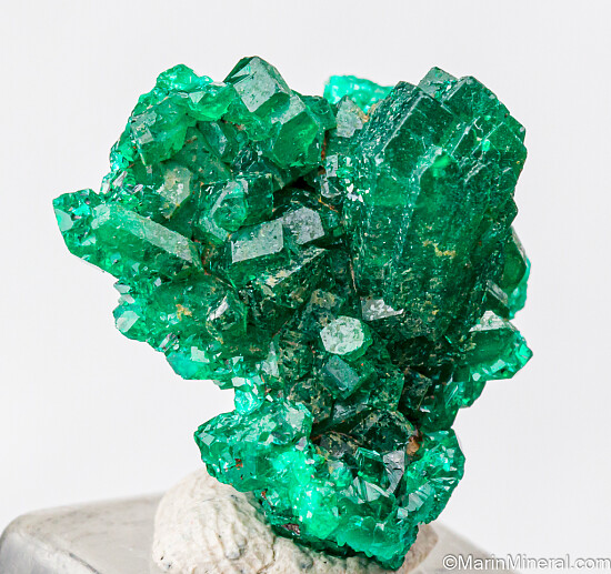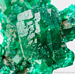 Cluster of bright, translucent, deep emerald green crystals of Dioptase from the Congo. Nothing but solid Dioptase without matrix. A nice thumbnail Dioptase with crystals on the backside too.