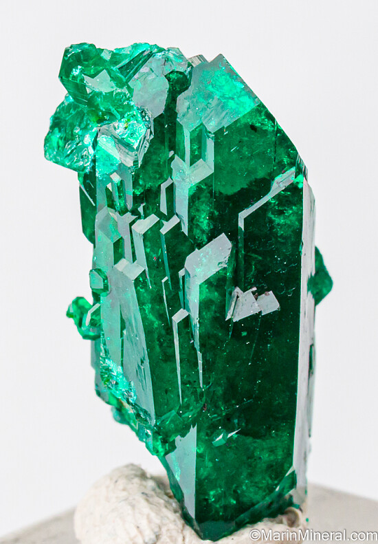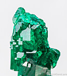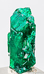 Elongated intergrown crystals of bright, translucent, deep emerald green Dioptase from the Congo. Nothing but solid Dioptase without matrix. Highly translucent, lustrous crystals, partially doubly-terminated and complete all around with contacts on each end.