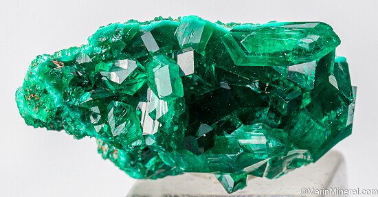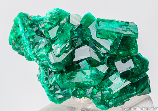 Cluster of deep emerald green Dioptase crystals from the Congo. The crystals are sharp and lustrous and show areas of transparency. This is all Dioptase with the crystals present on a matrix of Dioptase.
