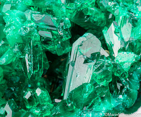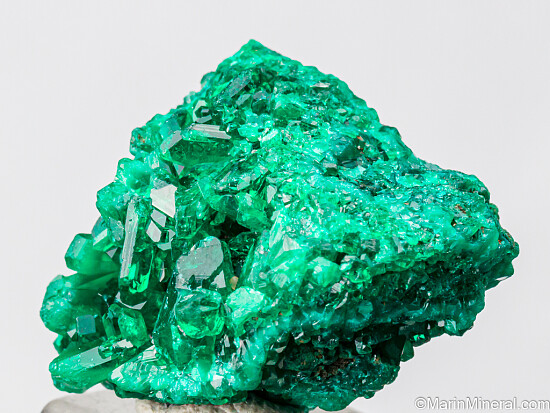 Crystals of deep emerald green Dioptase from the Congo. The crystals are sharp and lustrous and present on various sides of the specimen. This is all Dioptase with the crystals present on a matrix of Dioptase.