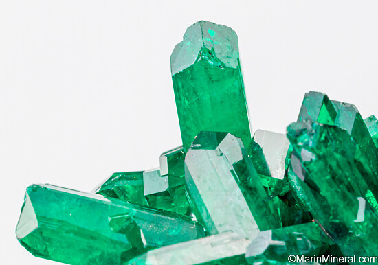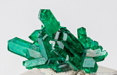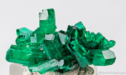 Crystals of deep emerald green Dioptase from the Congo. Attractive cluster of high quality crystals that are translucent to transparent.