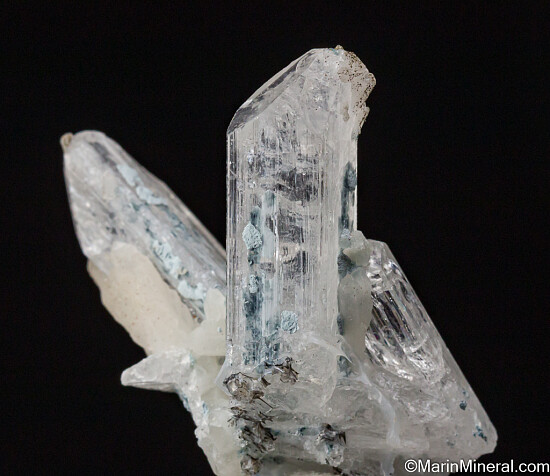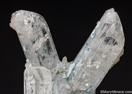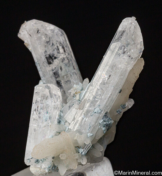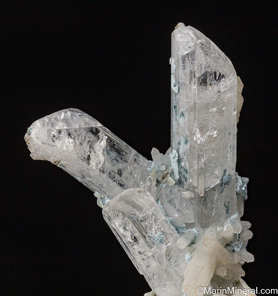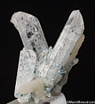 V-shaped cluster of three Danburite crystals with attached Quartz crystals from the classic Mexican locality. This is a beautiful display miniature with undamaged, well terminated crystals in an aesthetic arrangment.