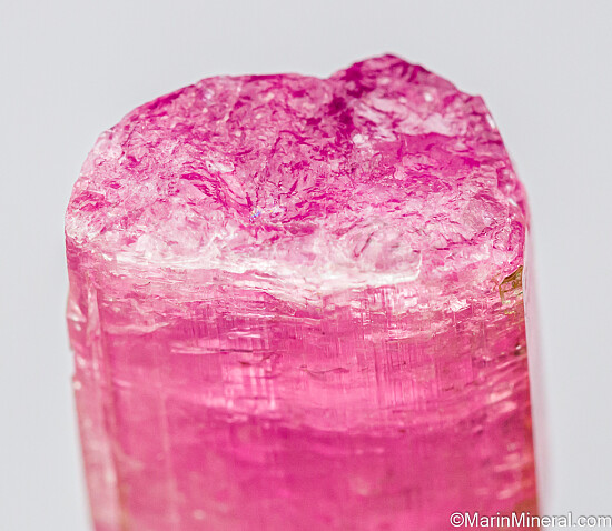 Single pink Tourmaline crystal from the Himalaya Mine in San Diego, California. The Tourmaline has the fantastic 'bubble gum' pink coloration the mine is known for. Unterminated crystal with gemmy zones. Weighs 8.81 grams.