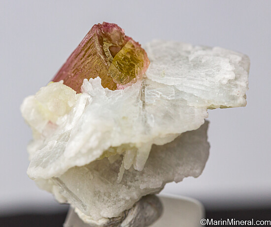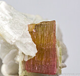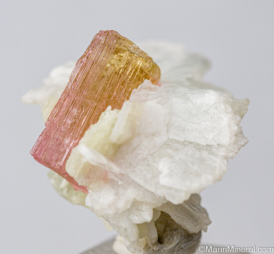 Gemmy pink Tourmaline crystal set in Albite from the Himalaya Mine in San Diego Co., California. This is a really neat and aesthetic specimen. The Tourmaline has naturaly etched crystal surfaces all over. There are gaps of 2-3mm between the the Tourmaline crystal and Albite crystals that show the size of the original Tourmaline crystal before it started to etch away.