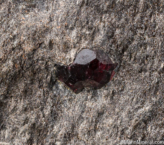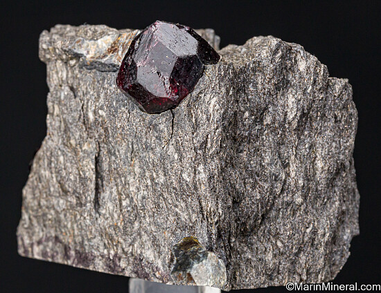 Three Almandine garnet crystals in schist matrix from the well known Wrangell Island locality in Alaska. The crystals reach 1.8cm wide with purple/red coloration and translucency and are well exposed from the schist. The garnets are nearly pristine with only very minor edge chipping. Sawcut on base. A USA classic.