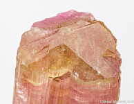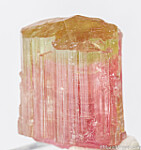 Pink and green transparent Tourmaline crystal from the famous Himalaya Mine in San Diego, California. The crystal is well terminated and complete with some contacting on the back side. Glassy and bright with a lustrous termination. Weighs 13.05 grams.