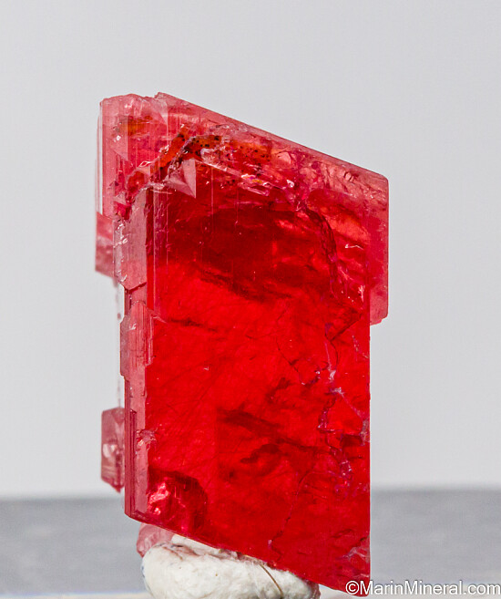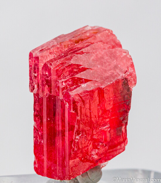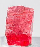 Single gem crystal of Rhodonite from recent finds in Brazil. This is a complete well terminated crystal with typical small raised crystal growths on some sides. Complete and undamaged, and transparent internally. Superb color!