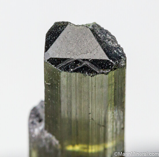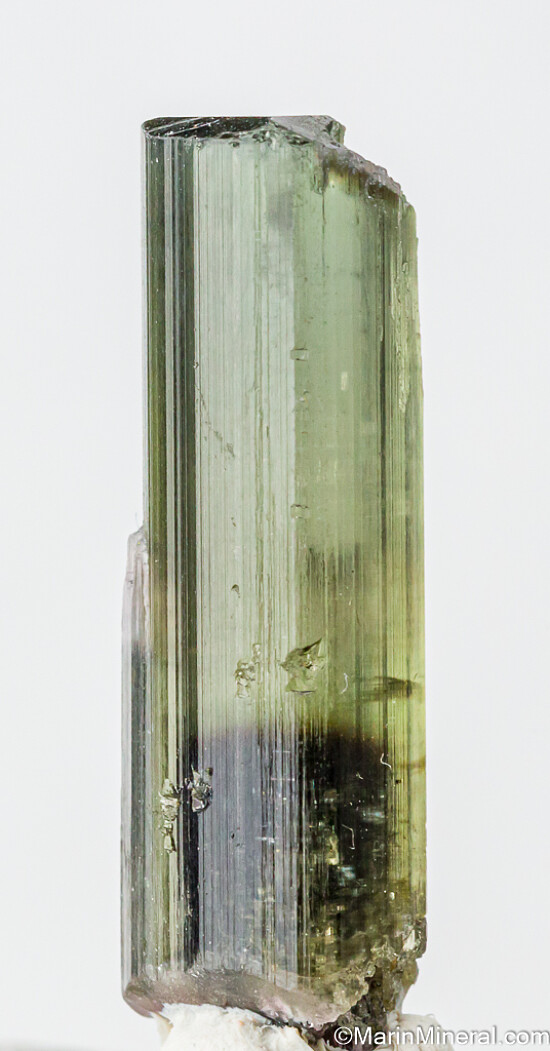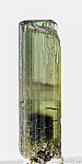Terminated single green Tourmaline crystal from the famous Himalaya Mine in San Diego, California. The crystal is complete all around and undamaged and has good transparency throughout most of the crystal with a dark green core at the base. Weighs 2.15 grams.