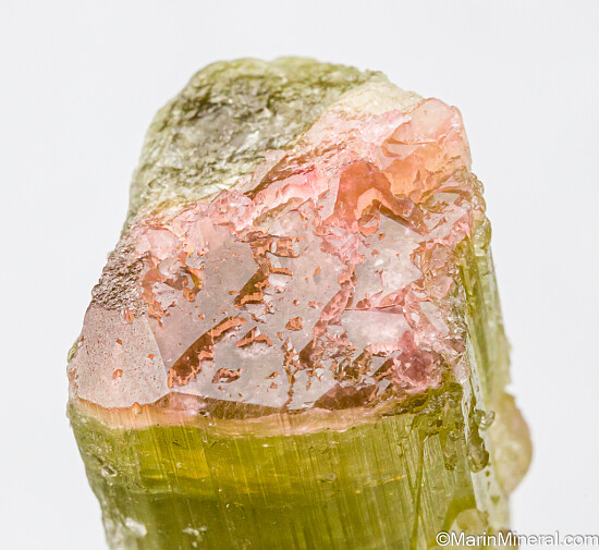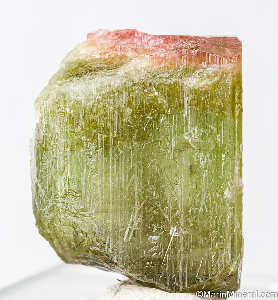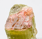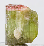 Single Tourmaline crystal from the Himalaya Mine in San Diego, California. The Tourmaline is gemmy and green with a partial pink termination. There is a gem nodule showing in the bottom of the crystal. Weighs 19.65 grams.