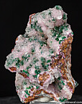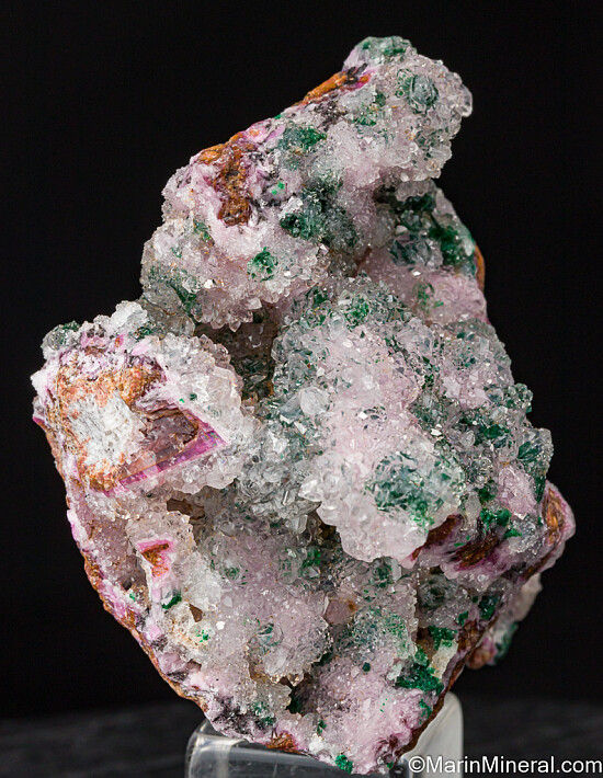 Colorful specimen of sparkling drusy Quartz over pink cobaltian Calcite and small isolated areas of Malachite. One of the best pieces from a small lot of these obtained by Tim Sherburn (who cleaned and trimmed this specimen) a few years ago. This was the only lot of these unusual specimens I've ever seen.