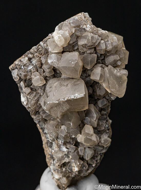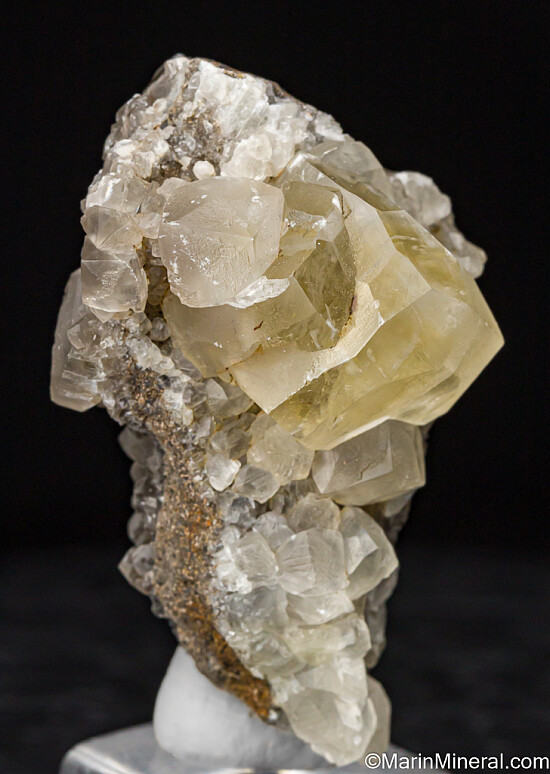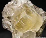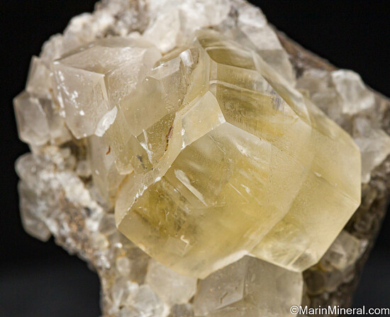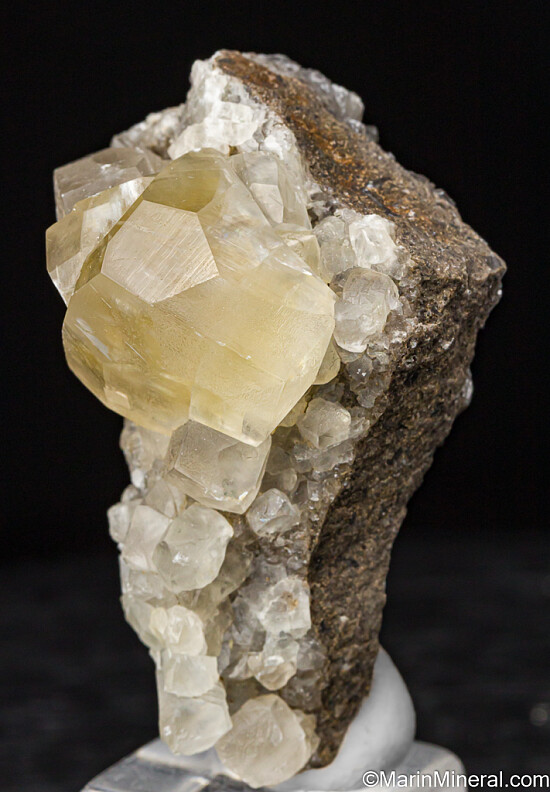 Calcite crystals with modified form on both sides of matrix from the Abbeytown Quarry. The main crystal is a beautiful undamaged yellow crystal 2.4cm wide. Ex. Tim Sherburn collection. Comes with a few old labels.