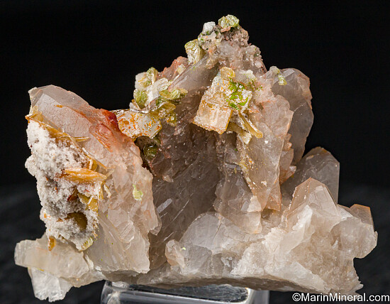 Quartz crystal cluster with attached orange Wulfenite and green Duftite. Some fo the Wulfenite form tight clusters of crystals. The Wulfenite crystals are present on all sides. Colorful and unusual Tsumeb specimen. Ex. Prosper Williams.