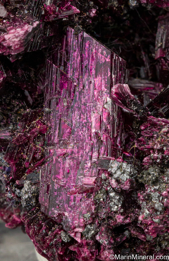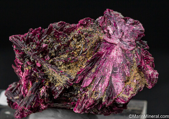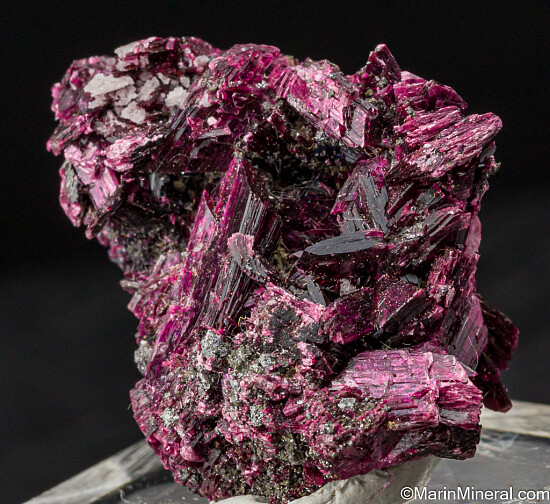 Thumbnail sized specimen of brilliant, metallic purple crystals of Erythrite. The main crystal is 1.5cm tall and well terminated, but there are great crystals all around, in fact it's nothing but solid Erythrite crystals. Valued at $250.