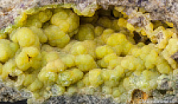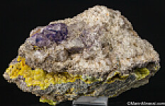 Vuggy specimen of bright yellow cadmium Smithsonite and purple Fluorite. Botryoidal, satiny Smithsonite is present in open vugs all around the specimen. The Sheshodonnell East Mine is a small former zinc mine that was worked in about 1862-63 (per MINDAT). The miners were lookng for the sphalerite and the smithsonite was placed in the dumps, and collected about 100 years later. Ex. Tim Sherburn collection.