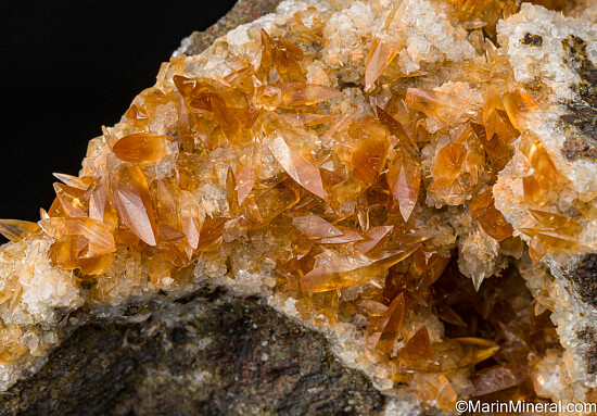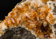 Elongated, gem quality reddish orange Calcite crystals on a matrix coated by Chabazite. Ex. Tim Sherburn collection.