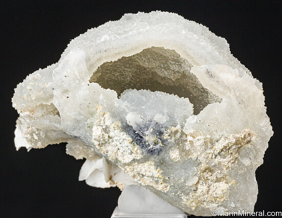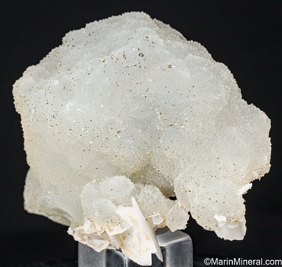 Large, hollow Quartz cast pseudomorphed after a now gone Calcite (?) crystal. Small Pyrite crystals add sparkle and platy white Calcite crystals are attached at the base. Ex. Tim Sherburn collection.
