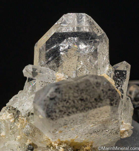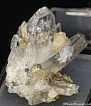 Glassy transparent tabular Quartz crystals with white Calcite rhombs. A cute thumbnail specimen. Old label indicates it's from the Soloman's Mine Pocket found October 1999. Ex. Tim Sherburn collection.