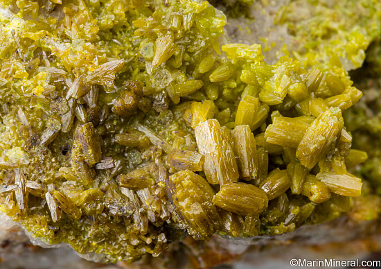 Green Pyromorphite crystals that stand out well against a white Quartz matrix. Mixed sized crystals with larger crystals to 4mm in size. Ex. David Green, Tim Sherburn collections.