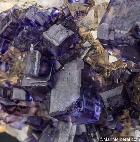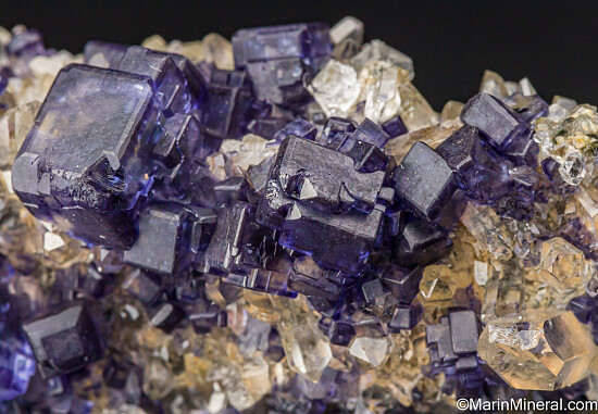Transparent purple/blue Fluorite crystals associated with trransparent Quartz crystals. The Fluorite form cubes with bevelled edges. Ex. Tim Sherburn collection.