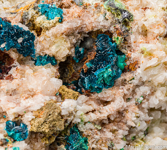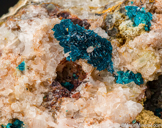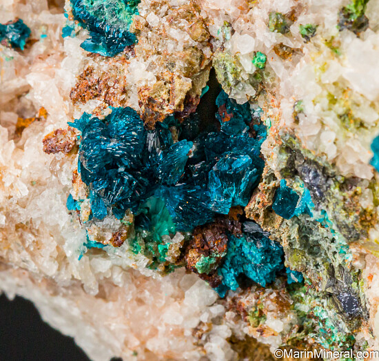 Vuggy matrix with multiple areas with radial clusters of blue Veszelyite. Beautiful, richly colored crystals of this rare species from a July 2020 find at an old Zinc mine.