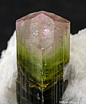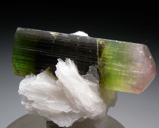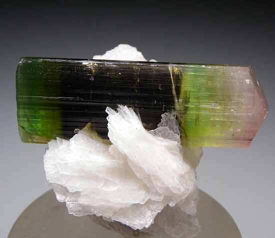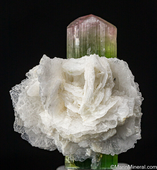 Doubly-terminated Tourmaline crystal with an attached cluster of Albite. The Tourmaline is 5 x 1.5cm with a pink, pyramidal termination on one end and a green, flat termination on the other end.