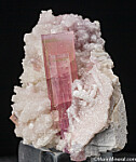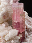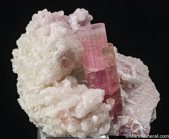 Pink Tourmaline crystals on Albite. The Tourmaline are glassy and terminated with a thin green zone near the termination.