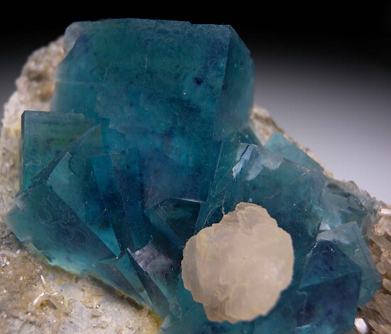 Transparent blue Fluorite cubes on matrix with attached Calcite and colorless Quartz crystals. The Fluorite cubes have internal phantoms. Beautiful well saturated color!