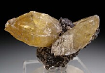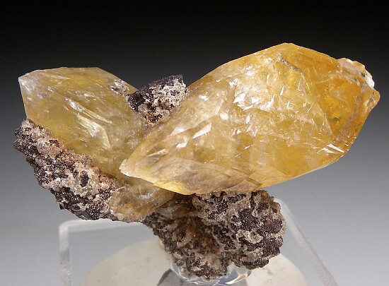 Two large, double-terminated Smithsonite crystals that display dramatically on matrix. This locality is not known for volumes of specimens but I have seen the occasional really interesting specimen from here over the years and this counts as one of them. The largest Smithsonite is 3.6cm wide and the specimen displays well from either side. There are unfortunately small cleaves on the tip of each crystal, but they don't ditract that much, especially when considering the rarity of the piece and the overall visual impact.