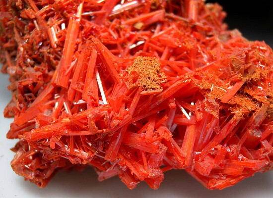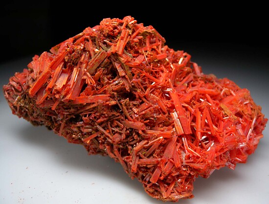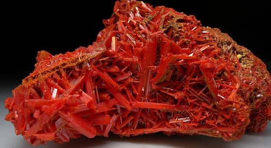 Large specimen of jackstraw clusteres of red Crocoite crystals. This is solid Crocoite crystals without matrix, a huge mass of crystals!