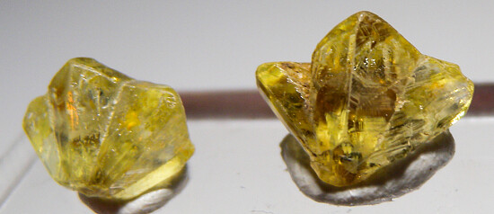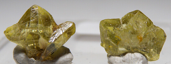 Two partial sixling Chrysoberyl crystals from old finds in Brazil. Both are bright and transparent, well crystallized on both the front and back sides. Valued at $200 for the pair.