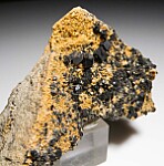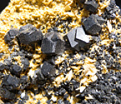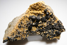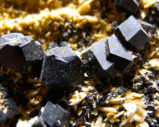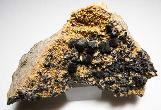 Black Andradite variety Melanite on matrix. Recently acquired from an old garnet collection, these are found nearby to the Benitoite Gem Mine in California. This is an excellent example with lots of good crystals with individual crystals to 5mm in size.