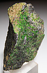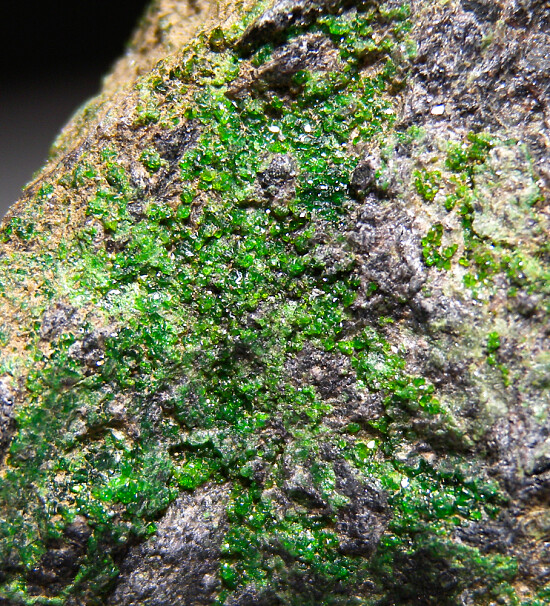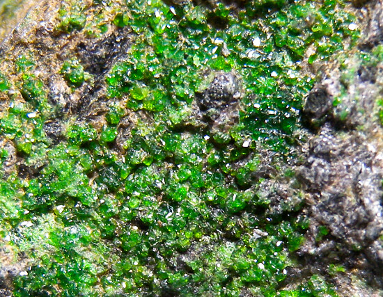 Bright green Uvarovite crystals on Chromite. These are rare California specimens collected by former dealer Chuck Trantham many decades ago.