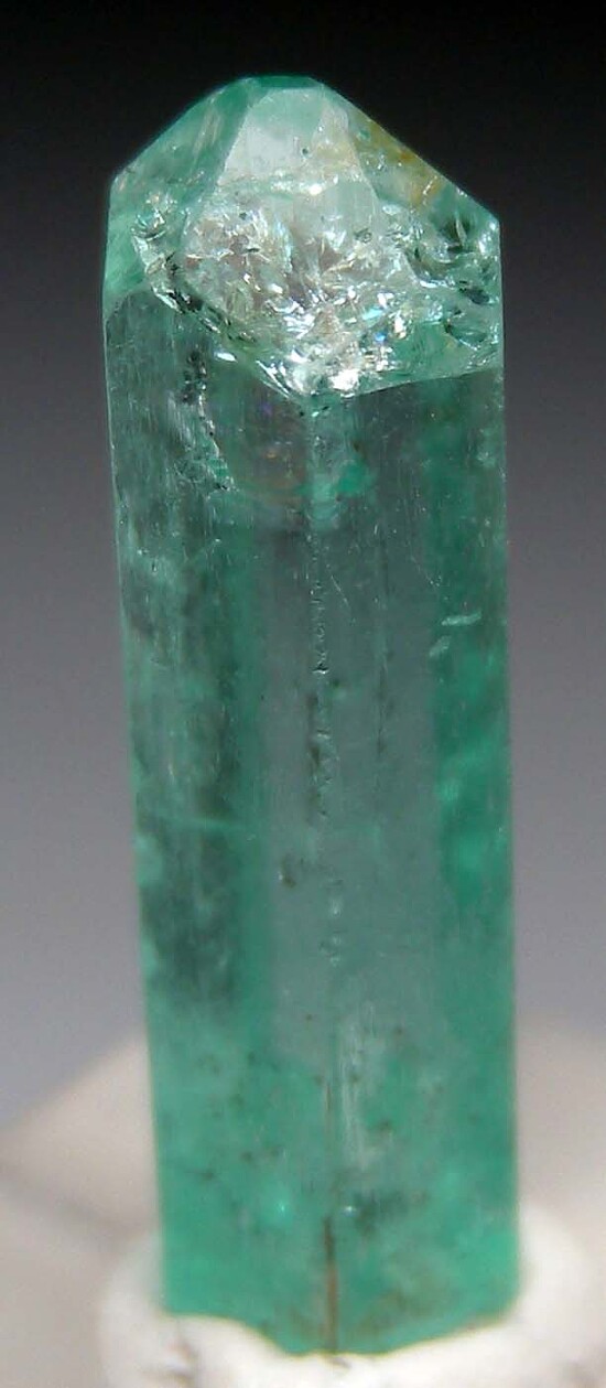 Single gem quality Emerald crystal from old finds in Jos, Nigeria. Highly transparent with a steep beveled termination. Complete all around and undamaged.
