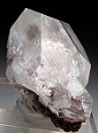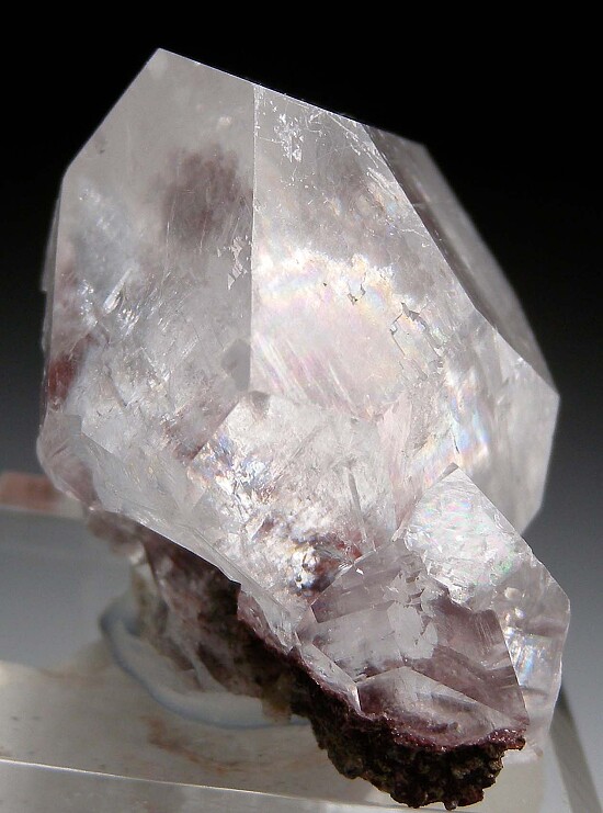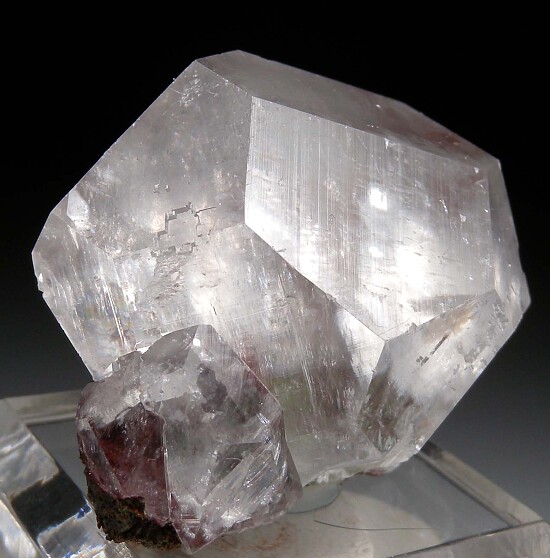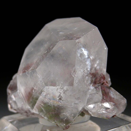 An amazingly sharp, well formed and complete Calcite crystal from Tsumeb featuring large, flat faces all around. It's translucent to transparent and some green Duftite and red Dolomite can be seen on the bottom. A really beautiful, high quality crystal. Comes mounted on a Lucite display stand.