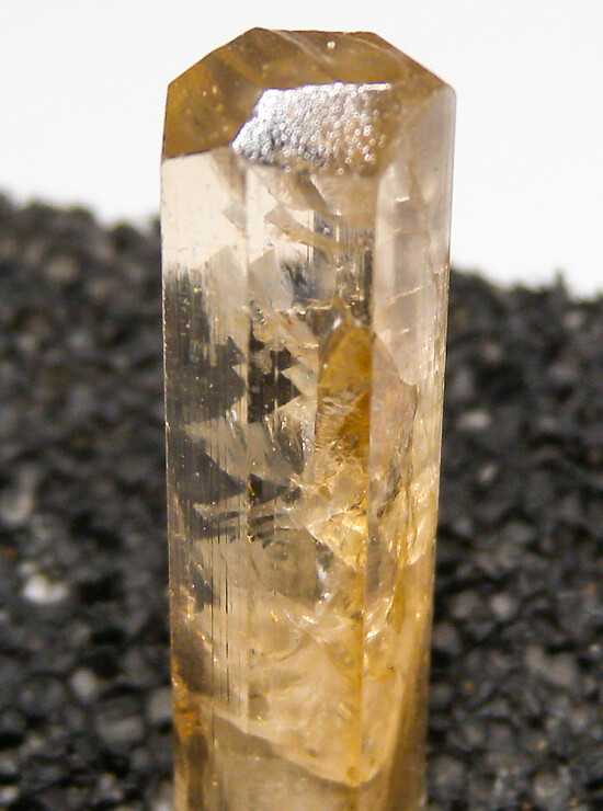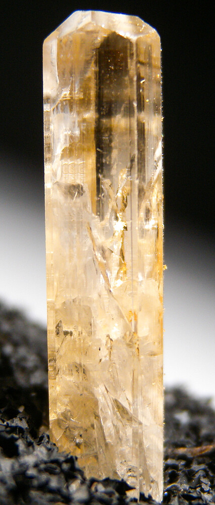 Single golden Danburite crystal from Madagascar. Complete all around and undamaged with glassy luster and areas of complete transparency. Uncommon crystal!
