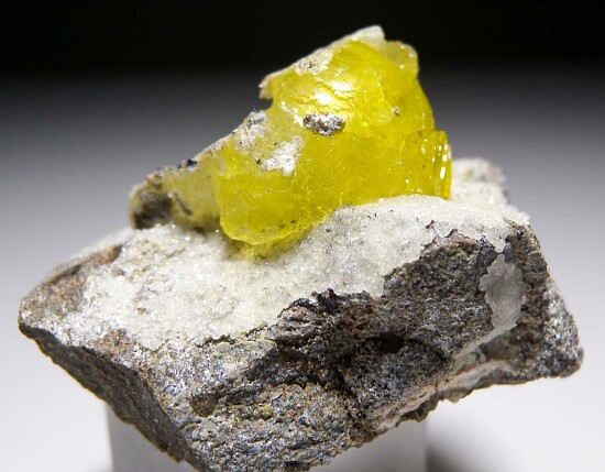 Spherical cluster of yellow Brucite on matrix from Pakistan. The Brucite is highly translucent to transparent, about as translucent as it gets. There is alot of Brucite available now, but not of this quality.