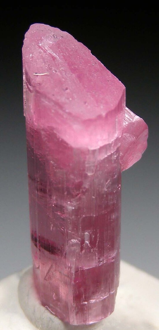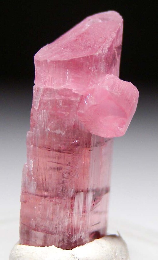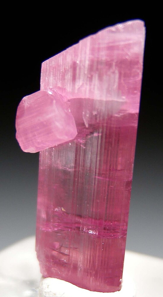 Terminated 'hot' pink Tourmaline crystal with a small side crystal attached. Complete and undamaged and highly transparent.