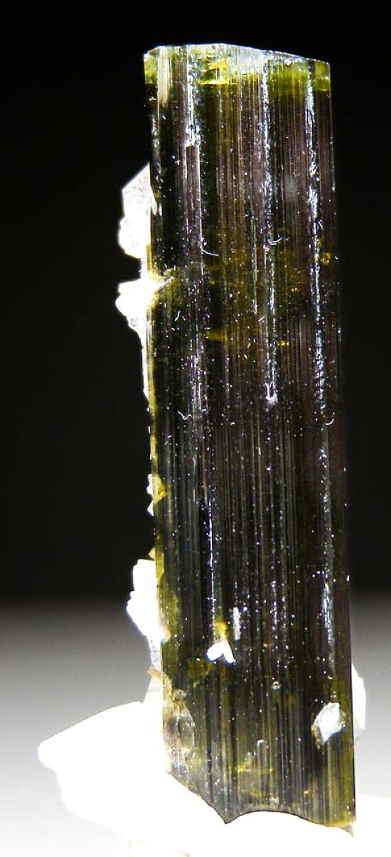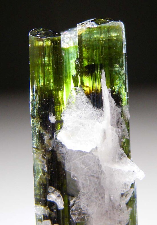 Tall, green-cap Tourmaline crystal with attached white Albite from Stak Nala. Most of these get dark below the termination, but this stays a gemmy green from the termination to nearly the very bottom. Glassy, complete and undamaged.