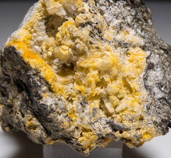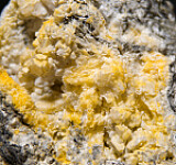 Colorless, translucent to transparent Thomsonite crystals in vugs on matrix. The Thomsonite form prismatic crystals with flat terminations. Collected by John Sulzbach in October 2014.