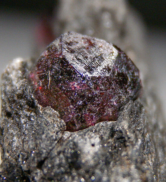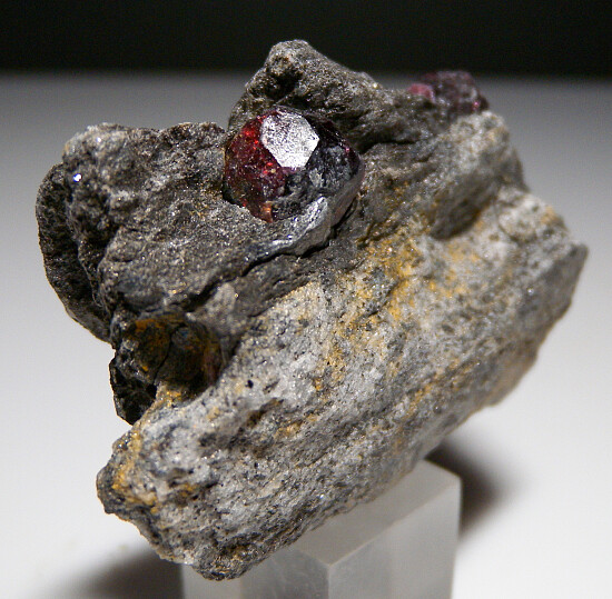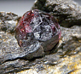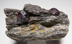 Two deep red Almandine garnet crystals to 1cm in schist. These look similar to those from the well known Wrangell Island locality in Alaska, but they are from the Bella Vista Mine, an island located very close to Wrangell.