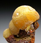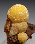 Globular yellow Smithsonite on matrix. The top spherical cluster is 1.1cm wide. Translucent, undamaged Smithsonite. The Masua mine was and old zinc and lead mine that closed in the 1990s and is noted for it's yellow Smithsonite.