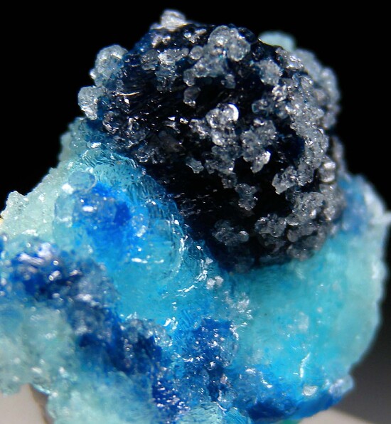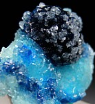 Fine thumbnail of Veszelyite on and under sky blue Hemimorphite. A robust, somewhat hemispherical group of Veszelyite crystals 1.1cm wide on translucent sky blue Hemimorphite. The main Veszelyite is dusted by micro Hemimorphite. Additional small Veszelyite crystals can be seen along the bottom beneath the Hemimorphite. Mined in 2022. The locality is a former Limestone quarry with Lead, Zinc, and Copper mineralization that closed in 2018.
