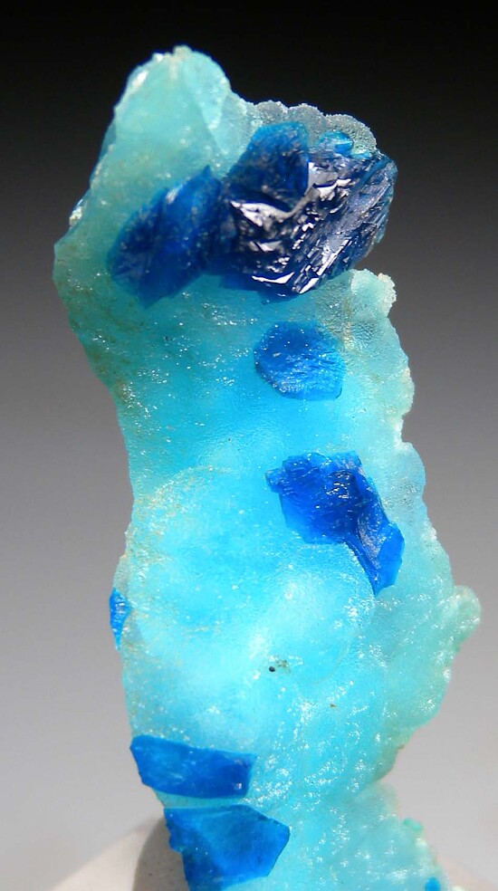 Fine thumbnail of Veszelyite on sky blue Hemimorphite. An elegant specimen with Veszelyite crystals 8mm on a thin, curving layer of translucent Hemimorphite. Mined in 2022. The locality is a former Limestone quarry with Lead, Zinc, and Copper mineralization that closed in 2018.