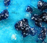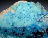 Large specimen of deep blue crystals of Veszelyite on sky blue Hemimorphite. An amazing cabinet sized matrix Veszelyite specimen, unheard of prior to this find. The Veszelyite crystal groups reach 9mm in size and are well separated. The Hemimorphite forms a botryoidal surface with a beautiful color contrast to the Veszelyite. In the upper half, dozens more Veszelyite crystals can be seen beneath the translucnet Hemimorphite. Mined in 2022. The locality is a former Limestone quarry with Lead, Zinc, and Copper mineralization that closed in 2018.